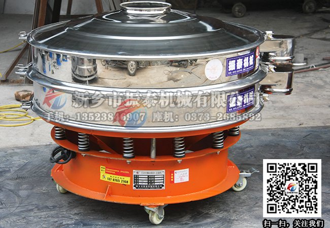 選振篩利用YZUL立式振動(dòng)電機(jī)作為激振源,通過振動(dòng)電機(jī)上下兩端的偏心重錘將旋轉(zhuǎn)運(yùn)動(dòng)轉(zhuǎn)變?yōu)樗健⒋怪?、傾斜的三次元運(yùn)動(dòng),并傳遞到旋振篩的篩面上;物料通過入料口進(jìn)入設(shè)備內(nèi),根據(jù)不同物料篩分要求,物料經(jīng)過1-5層采用不同目數(shù)的金屬編織篩網(wǎng)的篩分層,在這個(gè)過程中,位于各層的篩網(wǎng)下的清網(wǎng)裝置(彈跳球)通過頻率振動(dòng)不斷撞擊篩網(wǎng),使篩網(wǎng)上層物料能夠順暢的透網(wǎng)篩分,并有效解決了物料堵網(wǎng)問題出現(xiàn),不同目數(shù)的物料通過各層對應(yīng)目數(shù)的篩網(wǎng)后在各層的出料口排出,最終實(shí)現(xiàn)篩選除雜或過濾分級(jí)的目的。調(diào)節(jié)上、下兩端的相位角,可以改變物料在篩面上的運(yùn)動(dòng)軌跡。