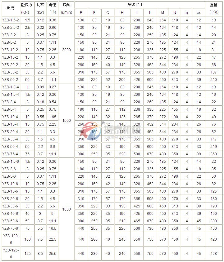 YZS振動電機技術參數: